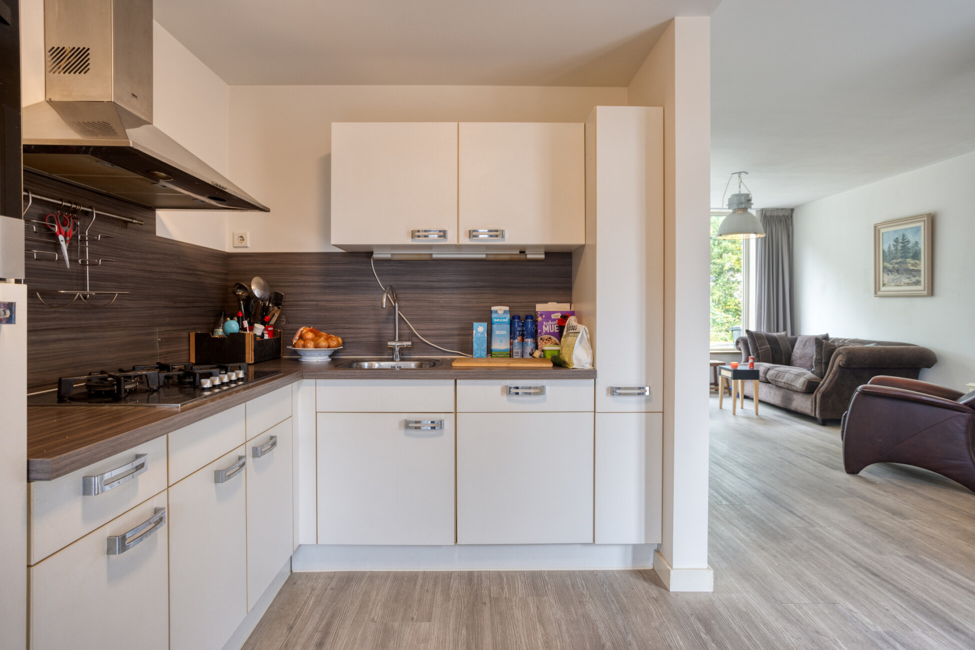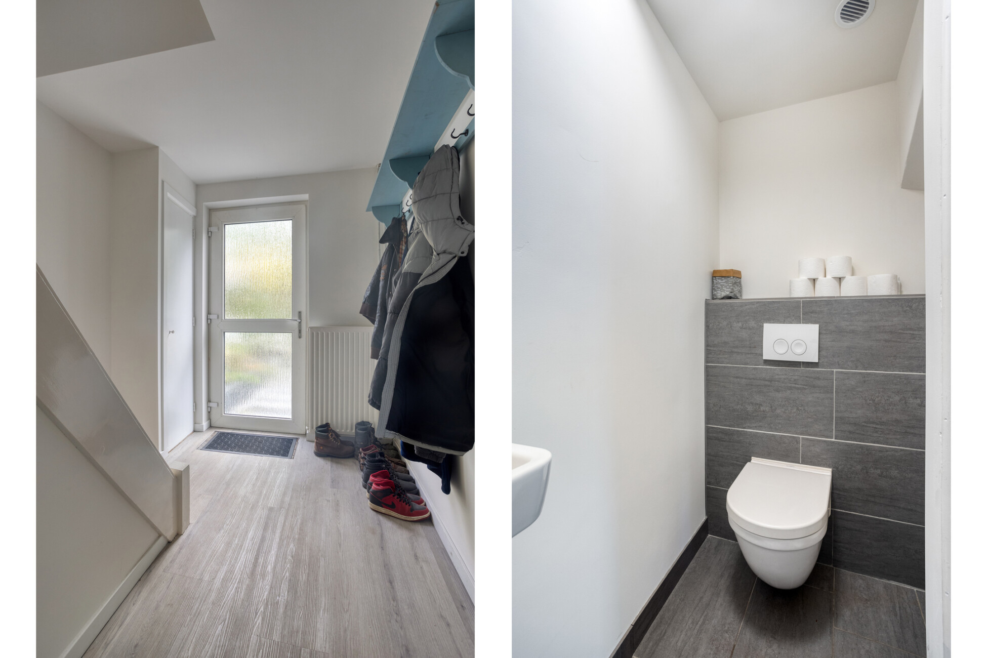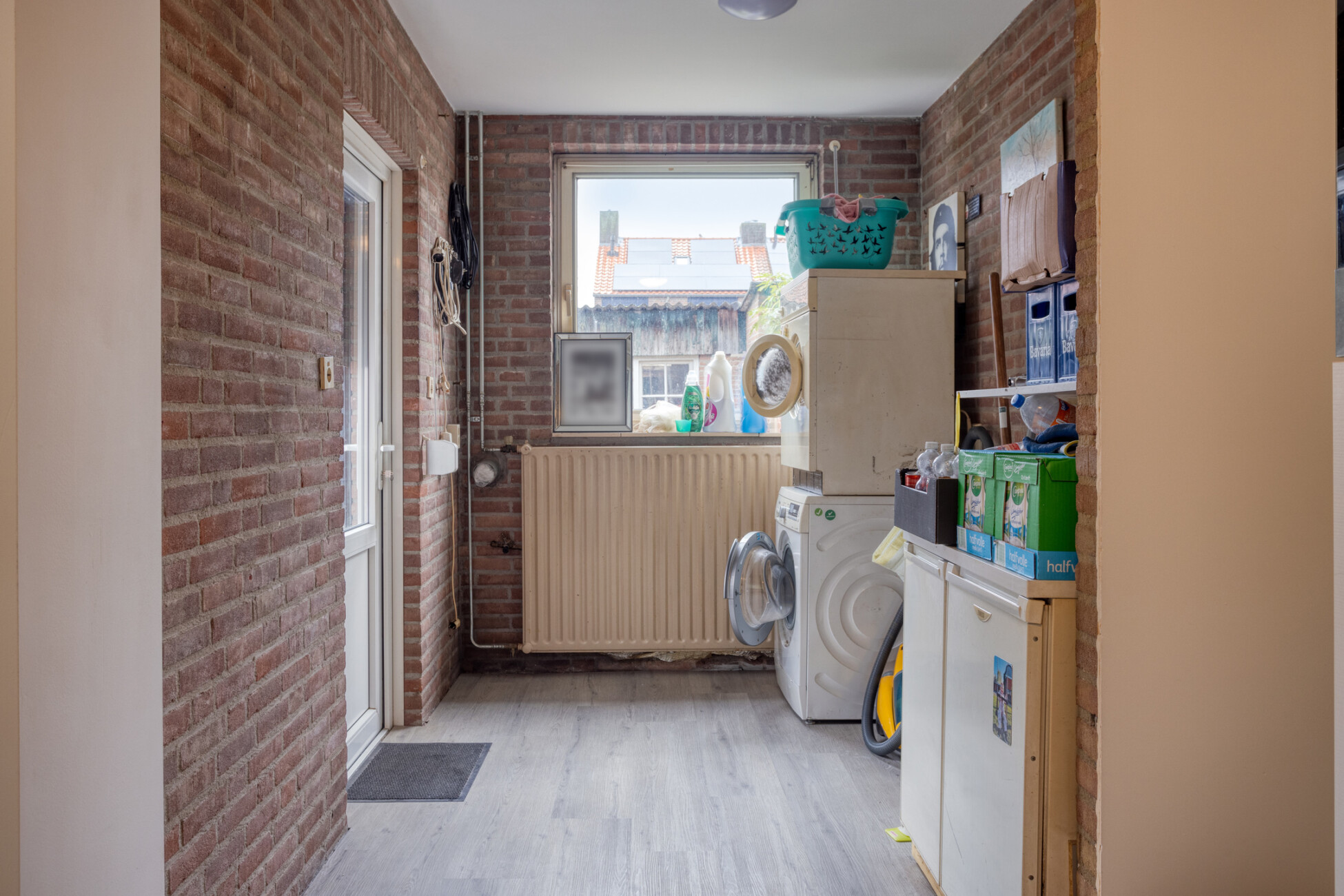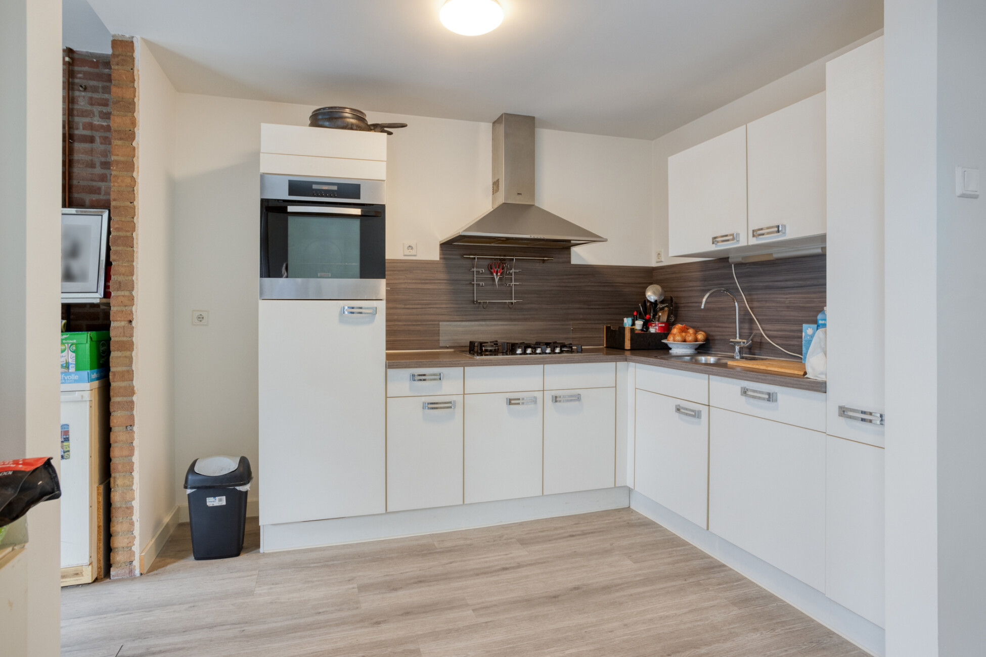 De moderne keuken (2020) is volledig uitgerust met een afzuigkap, gasfornuis, oven, koel-vriescombinatie en vaatwasser, en loopt door in de praktische bijkeuken met witgoedaansluitingen en toegang tot de tuin.