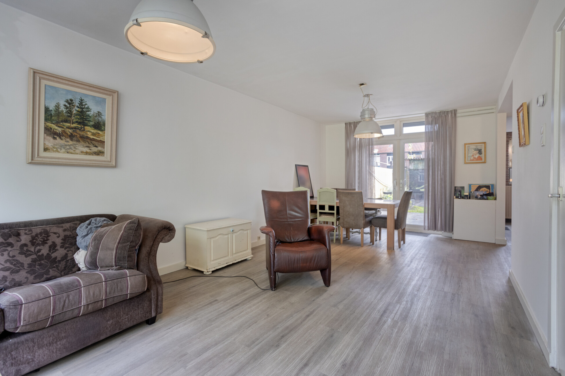 Binnenkomen doe je in de lichte en uitnodigende woon-/eetkamer, waar grote raampartijen en dubbele openslaande tuindeuren zorgen voor een overvloed aan natuurlijk licht. De ruimte is modern afgewerkt met een strakke PVC-vloer met vloerverwarming en biedt een natuurlijke indeling met een gezellige zithoek aan de voorzijde en een sfeervolle eethoek aan de achterzijde, met uitzicht op de tuin.
