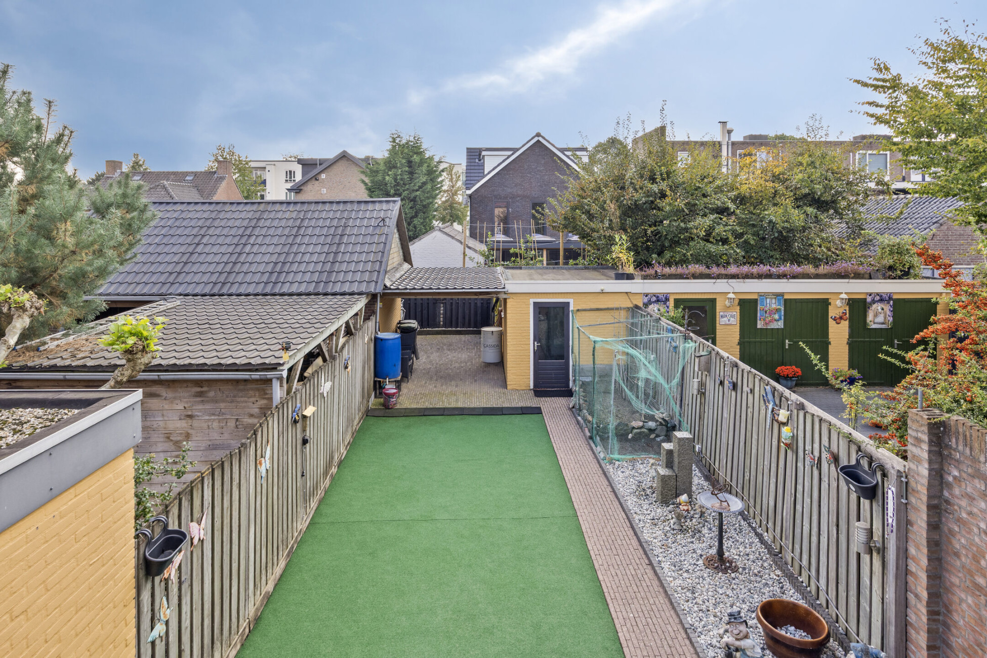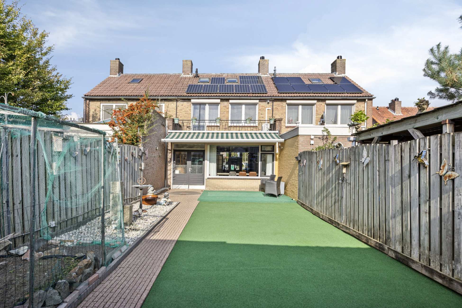 De onderhoudsvriendelijke tuin is keurig aangelegd en biedt ruimte om te ontspannen. Dankzij de zonwering kun je op warme dagen heerlijk beschut zitten. Achterin de tuin vind je een praktische berging met overkapping, perfect voor fietsen en tuinspullen.