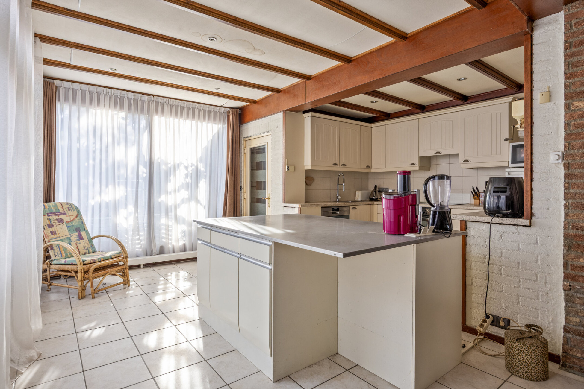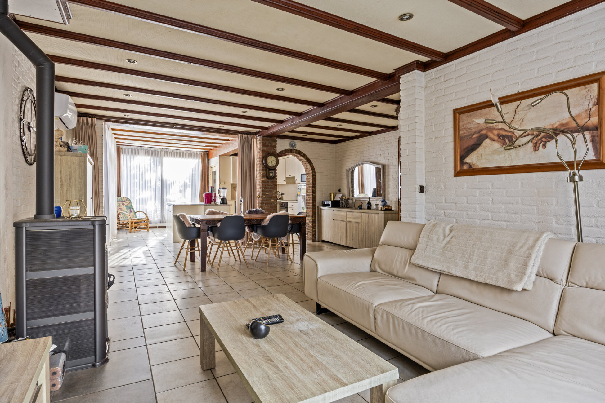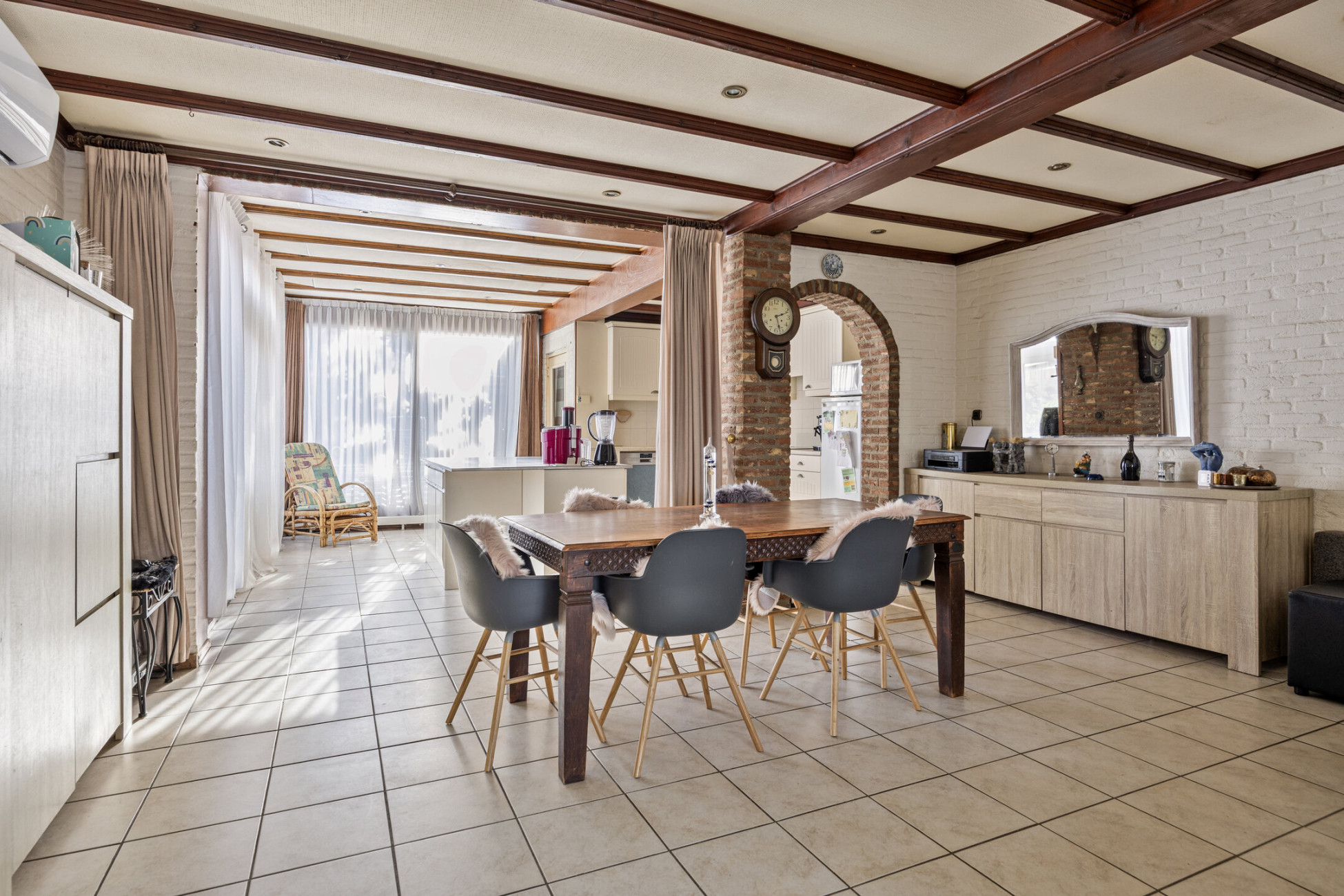 De entree biedt toegang tot de trapopgang, meterkast en dubbele deuren naar de ruime benedenverdieping. Aan de voorzijde bevindt zich de gezellige zithoek met open haard en airconditioning, perfect voor zowel zomer als winter. De woning is aan de achterzijde uitgebreid met een lichte serre die zorgt voor extra leefruimte en comfort dankzij de vloerverwarming. De open keuken is royaal opgezet met een werkeiland, inductiekookplaat, afzuigkap, oven en vaatwasser. Vanuit de keuken is er toegang tot de bijkeuken en het toilet.