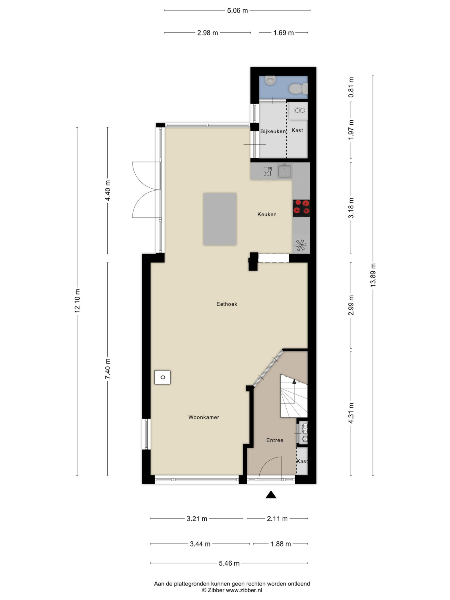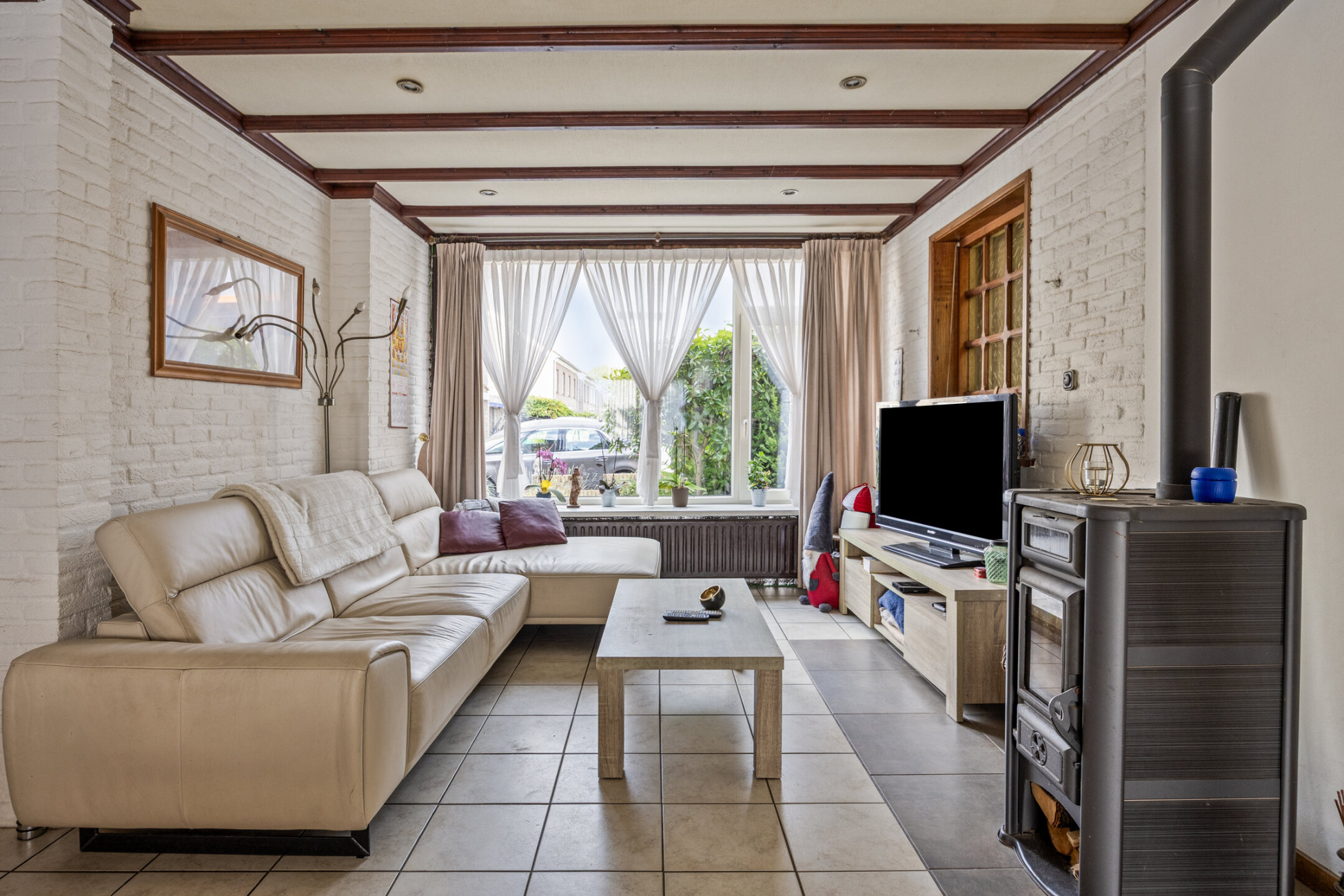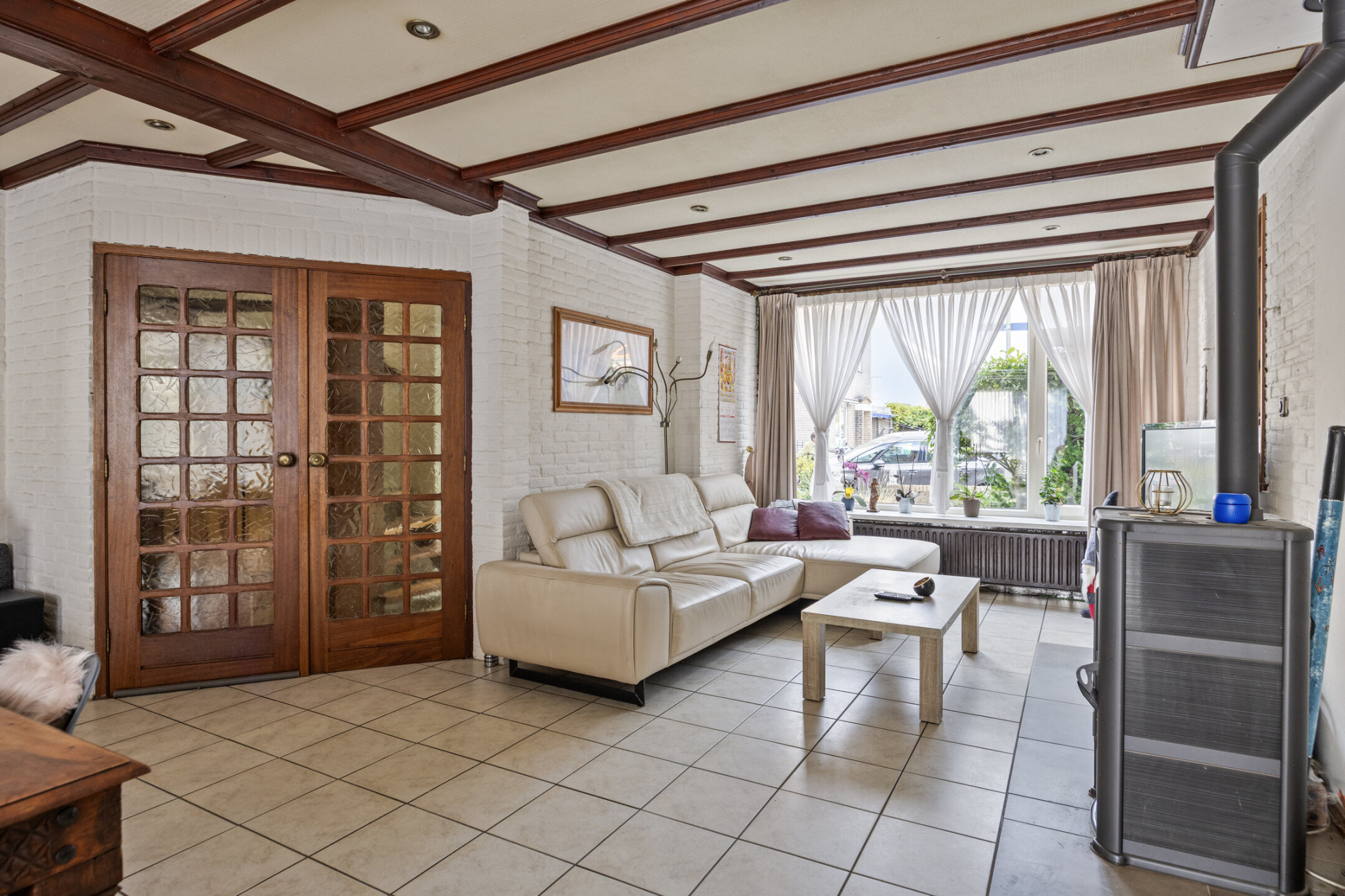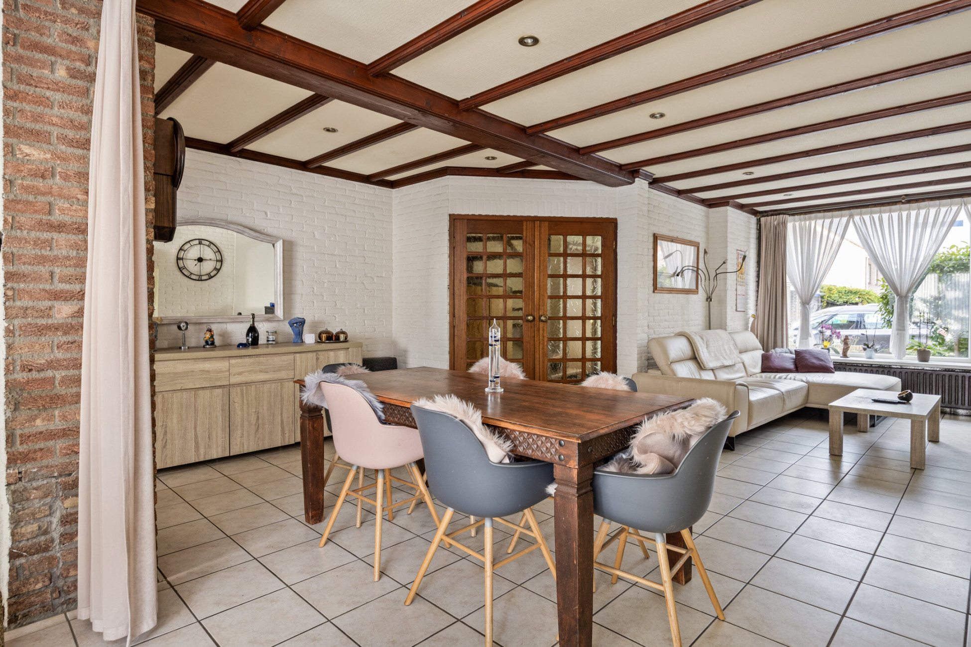 De entree biedt toegang tot de trapopgang, meterkast en dubbele deuren naar de ruime benedenverdieping. Aan de voorzijde bevindt zich de gezellige zithoek met open haard en airconditioning, perfect voor zowel zomer als winter. De woning is aan de achterzijde uitgebreid met een lichte serre die zorgt voor extra leefruimte en comfort dankzij de vloerverwarming. De open keuken is royaal opgezet met een werkeiland, inductiekookplaat, afzuigkap, oven en vaatwasser. Vanuit de keuken is er toegang tot de bijkeuken en het toilet.