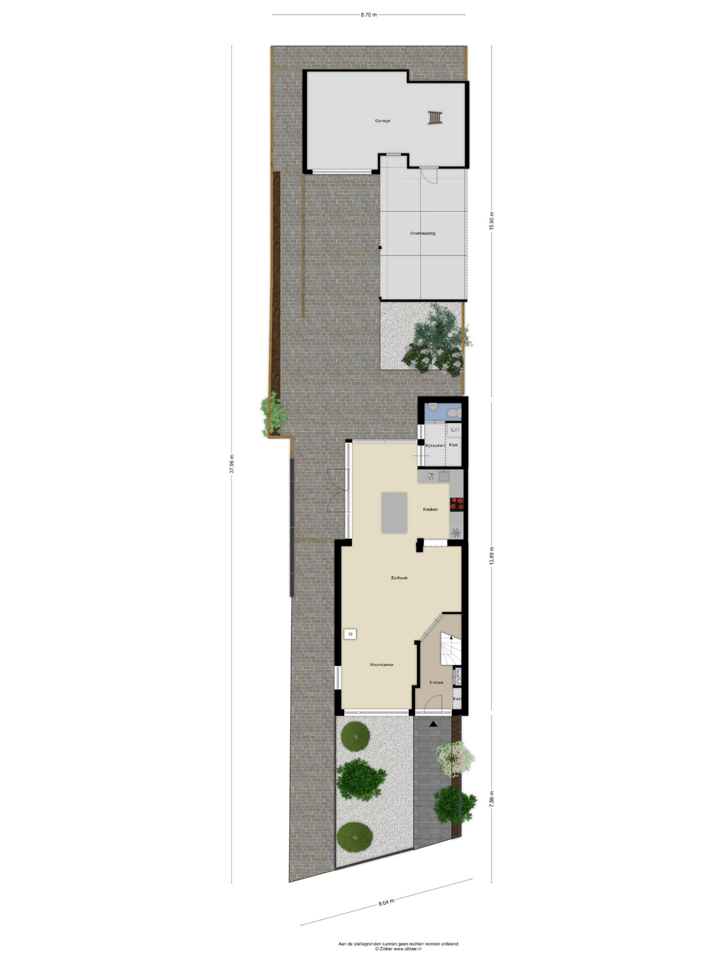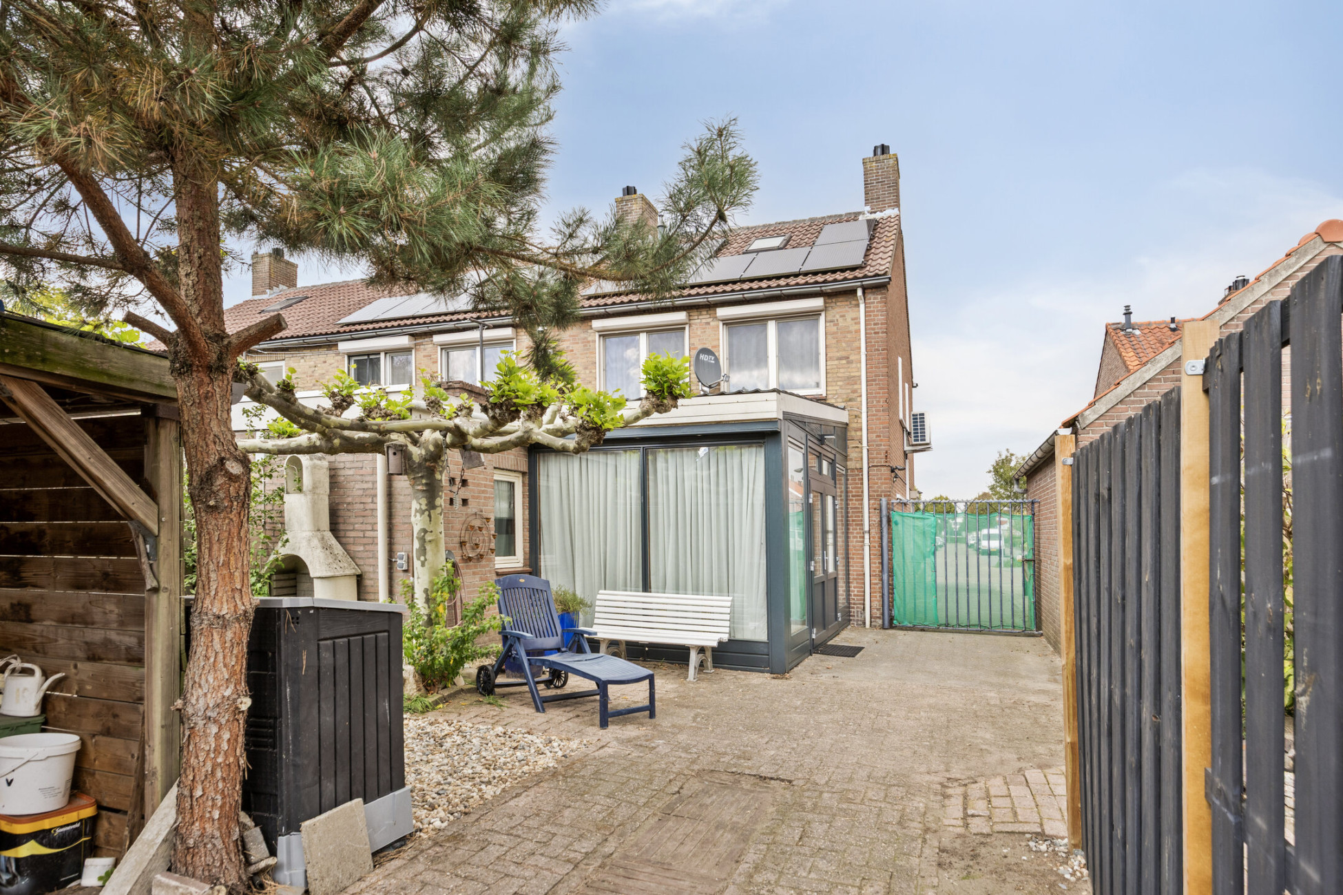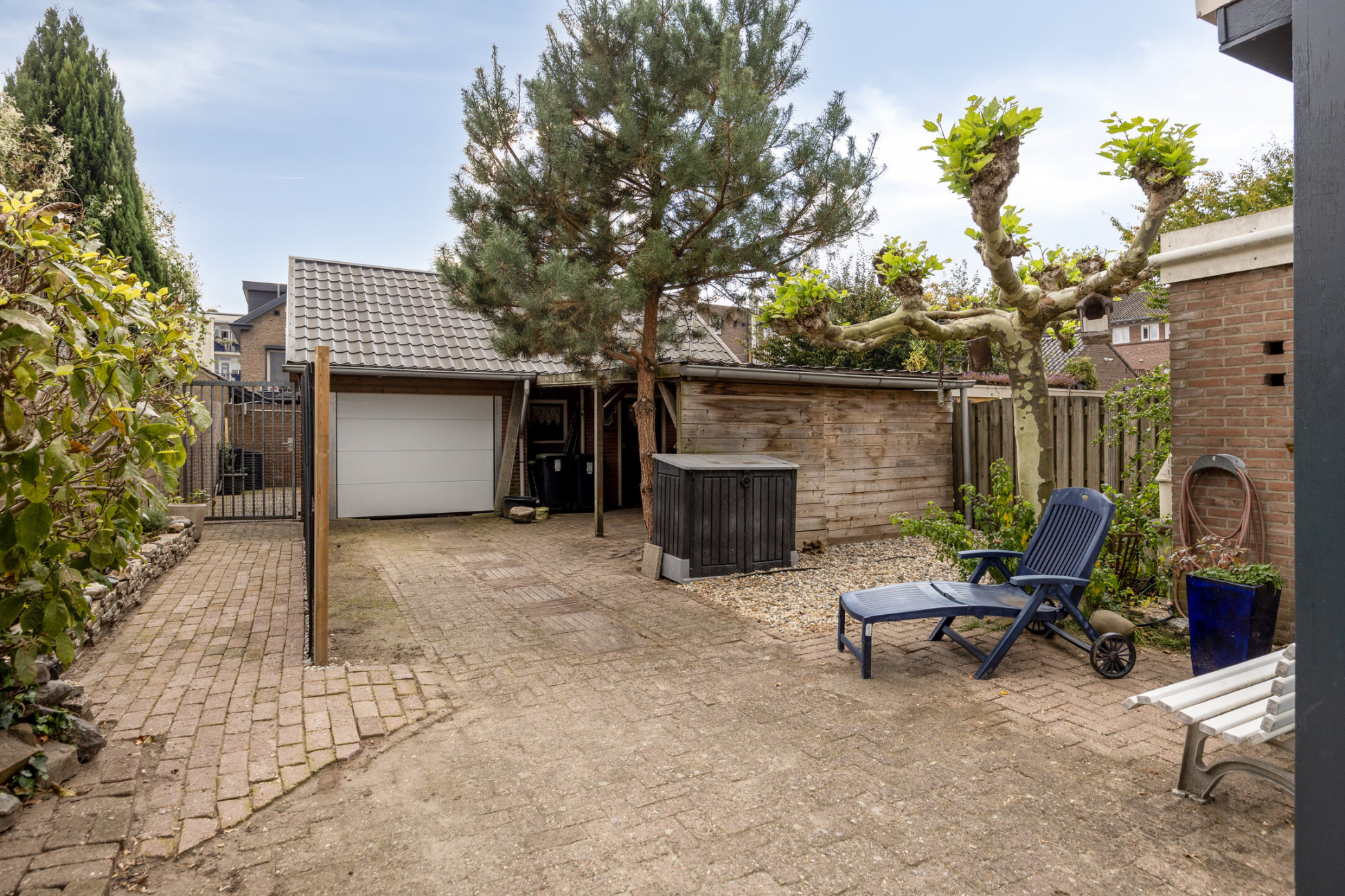 De ruime achtertuin is voorzien van een fijne overkapping, waar je in alle seizoenen kunt genieten van het buitenleven. Achterin de tuin, grenzend aan de overkapping, bevindt zich een garage van maar liefst 27 m² met een vlizo zolder – perfect voor hobby’s, klussen of extra opslag.