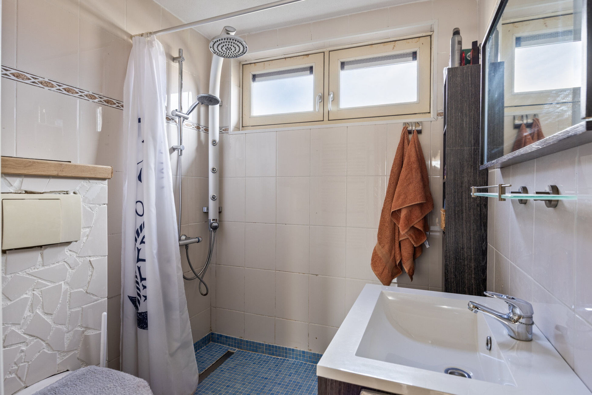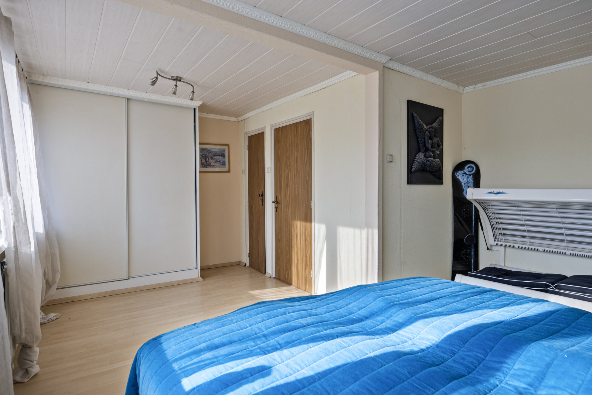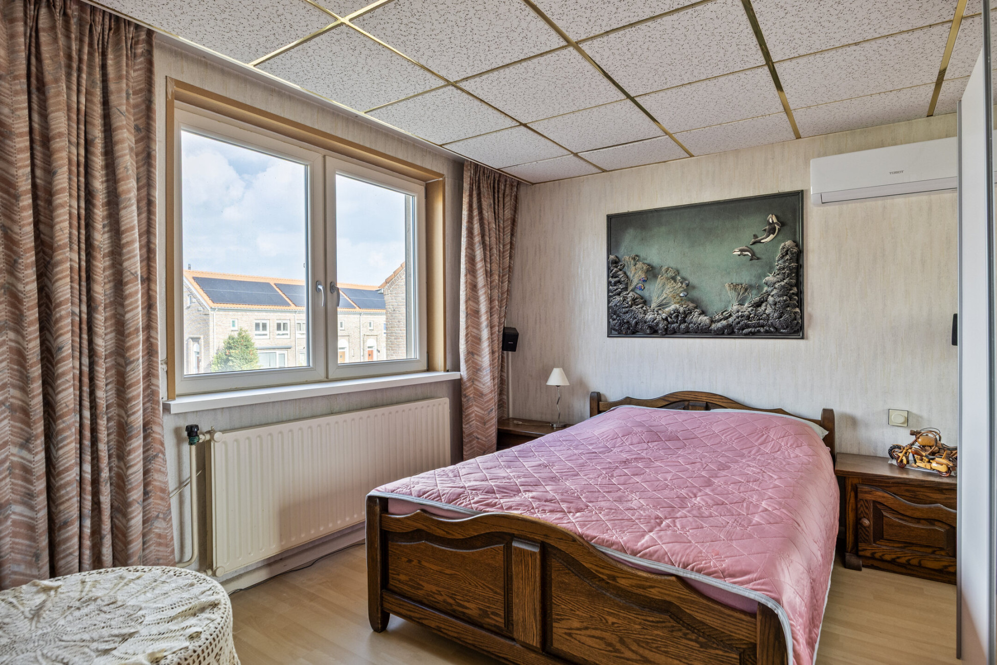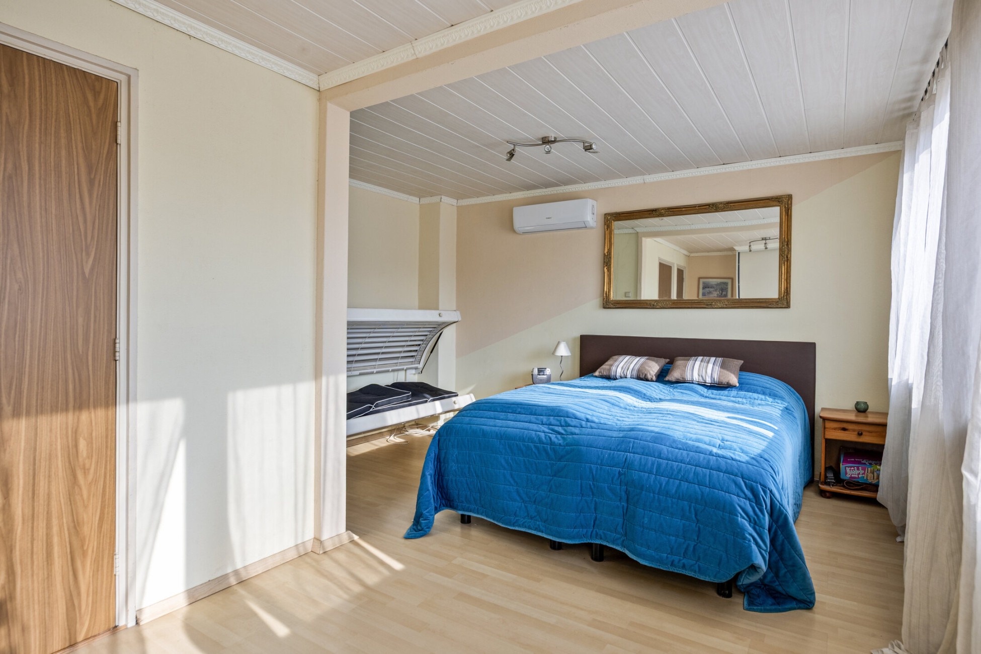 Op de eerste verdieping bevinden zich twee ruime slaapkamers van 11 m² en 20 m², beide voorzien van airconditioning. De overloop biedt extra opbergruimte dankzij een praktische opbergkast. De badkamer beschikt over een toilet, douche en wastafel met wastafelmeubel. Dankzij het raam is er voldoende daglicht en natuurlijke ventilatie.